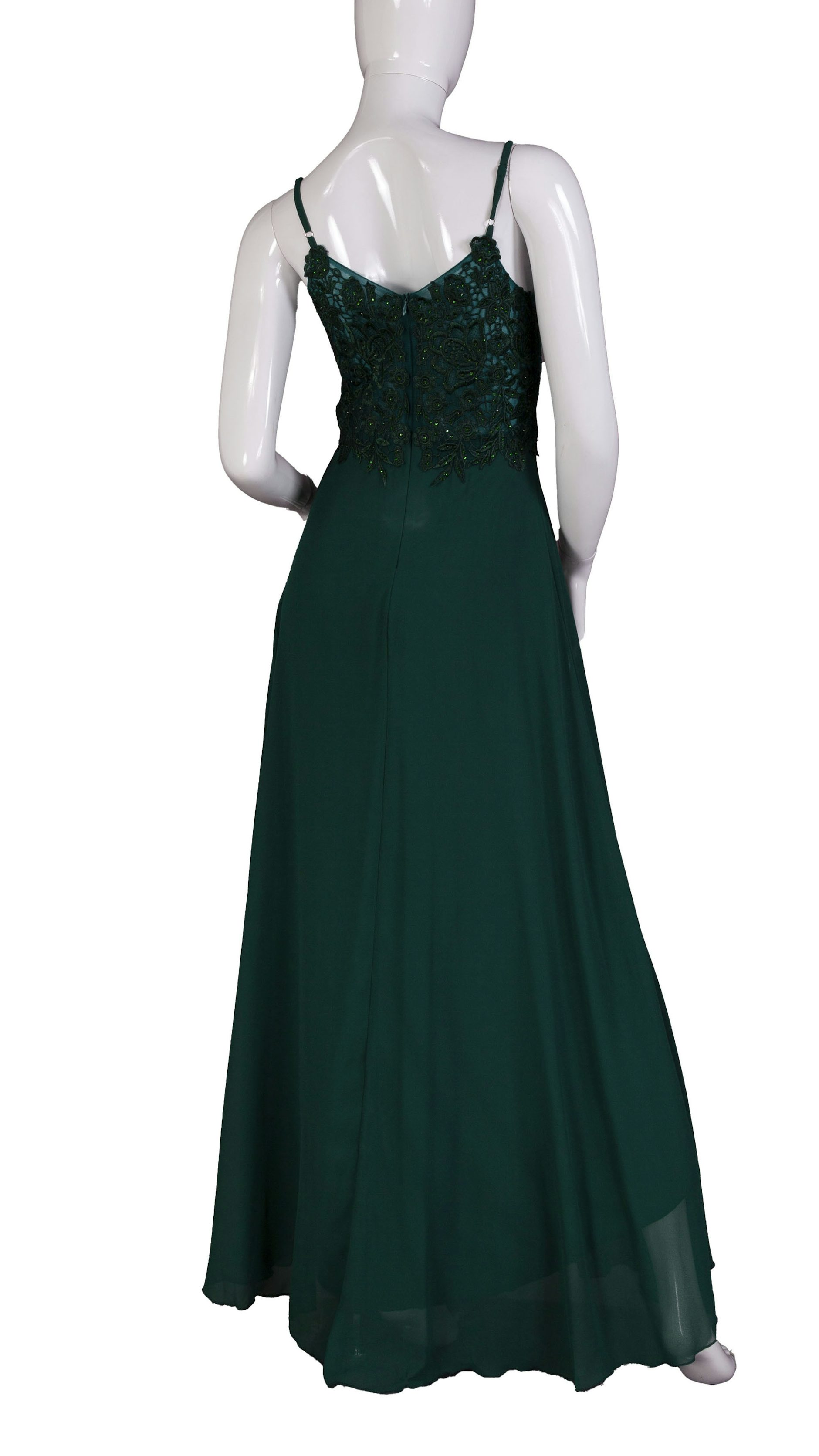 Het topje van deze groene avondjurk is van kant en heeft dunne spaghetti bandjes. Het decolleté is vrij diep en je zou er dus een mooi sieraad bij kunnen dragen. De rok loopt naar onderen toe wijd uit en geeft je lengte.
