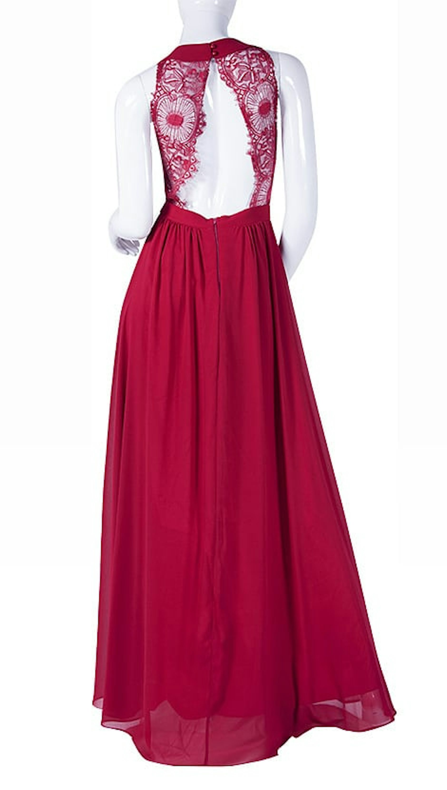 Van voren is dit een eenvoudige feestjurk met een mooie diepe V-hals. De top is van geplooide stof en heeft brede schouderbanden. De charme van deze lange jurk zit aan de achterkant: fijn kant omlijst de verder blote rug.